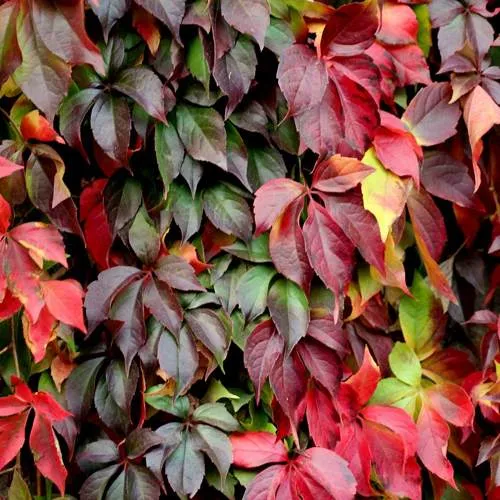 Листья: Расположены очерёдно, 5-листочковые, 10 см длиной, эллиптические или узко обратно-яйцевидные, тёмно-зелёные, снизу голубоватые, осенняя окраска яркая огненно- или багряно-красная. Листья в тени жёлто-оранжевые.