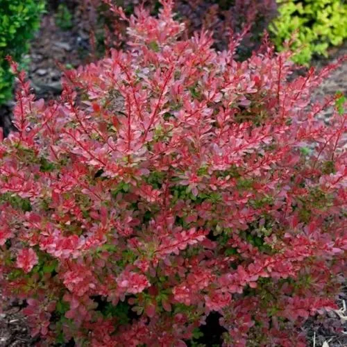 Это одна из самых красивых разновидностей барбариса. Взрослые растения достигают 2–2,5 м, диаметр кроны 2,5–3 м. Ветви ребристые, дугообразные, кора ярко-красная, оранжевая, со временем приобретает бурый и темно-коричневый цвет.