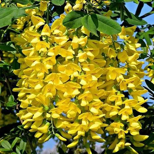 Цветение Бобовника анагиролистного происходит с апреля по июнь, и это время, когда он поразительно хорош. Его средних размеров желтые цветы, имеющие форму похожую на бабочек, образуют длинные соцветия, которые могут достигать 60 сантиметров в длину. Это создает эффект "золотого дождя".
