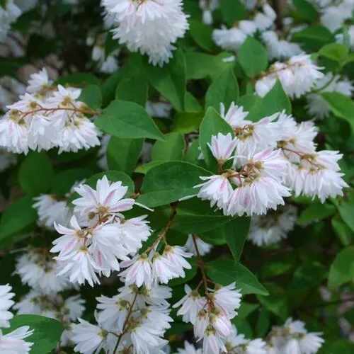 Красивый листопадный кустарник с раскидистой зонтиковидной формой кроны, до 2 м в высоту и 1,5-2 м в диаметре. Листья яйцевидные, темно-зеленого цвета, шершавые, 5-10 см в длину. Цветет обильно, в июне-июле. Цветы небольшие, махровые, белые, с едва заметным розовым отливом, собраны в рыхлые метельчатые соцветия, которые придают растению ажурность. Зимостойка. Лучше размещать кусты на открытых либо слегка затененных от полуденного солнца местах. К почве не требователен.