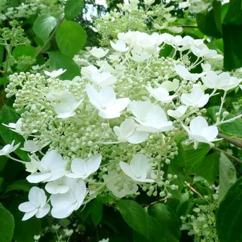 Декоративность высокая – она радует глаз крупными и ароматными цветками. Соцветия располагаются на верхушках побегов, имеют слегка выпуклую форму и крупный размер – до 25 см в диаметре. Цветки данного сорта кремовато-белые с белоснежными краевыми стерильными цветками. Состав соцветия состоит из стерильных и плодущих цветков диаметром до 2 см.