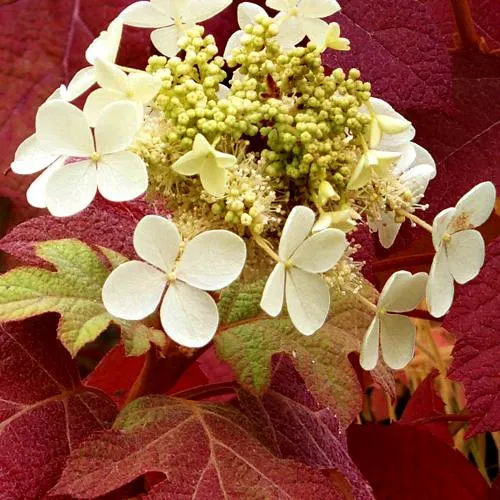 Листья имеют форму, напоминающую дубовые листья, и зеленую окраску. В осенний период они окрашиваются в богатые оттенки оранжевого, красного и фиолетового, делая куст особенно привлекательным.