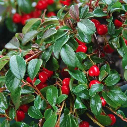 Листья кустарника кожистые и имеют форму эллипса. Цветы красного оттенка, а созревание плодов (которые непригодны для еды) происходит к сентябрю. Средний размер листа кизильника — 1,5–2 см. Сверху цвет листика зеленый, а снизу он имеет сероватый оттенок.