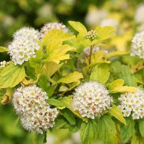 В июне-июле пузыреплодник «Ангел Голд» радует глаз белыми щитковидными соцветиями небольшого размера (до 5 см), которые добавляют элегантности и легкости в общую композицию. Осенью вы сможете наблюдать за формированием острых бурых плодов, которые долго сохраняются на кустах и придают дополнительную текстуру ландшафту.