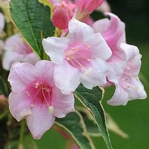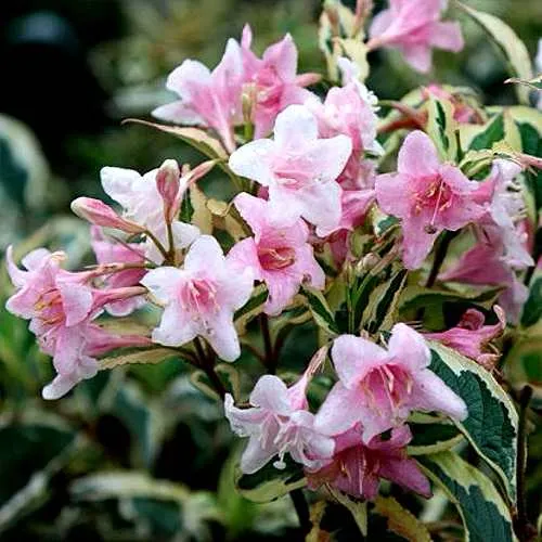 В конце весны кустарник покрывается светло-розовыми бутонами, собранными в соцветия. В период расцвета они так покрывают крону, что листья становятся незаметными. Бутоны имеют колокольчатую форму. Цветение вейгелы Вариегата длится в течение всего июня. Затем наступает небольшой перерыв, после которого на растении вновь могут распуститься нежно-розовые соцветия.