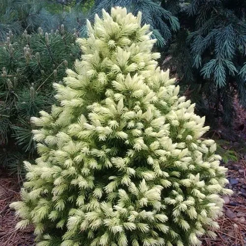 Окраска хвои у сорта Дейзи уайт является ее главным достоинством. Она может меняться в зависимости от условий выращивания и возраста растения. Молодые ели могут иметь хвою белоснежного, нежно-кремового или светло-салатового оттенка, иногда приобретают цвет слоновой кости. Ближе к середине лета вырастает молодая поросль ярко-зеленого цвета.