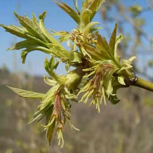Клен ясенелистный относится к лиственным деревьям. Дерево имеет короткий, разветвленный у основания ствол коричневого цвета. Чем старше дерево, тем темнее кора его ствола. У молодых кленов на поверхности коры имеются мелкие трещины. По мере «взросления» дерева они становятся глубже, постепенно превращаясь в бороздки. От разветвления ствола отходят длинные, раскидистые, гладкие ветви зеленого или оливкового цвета. На ветвях дерева часто можно увидеть сизый, реже фиолетовый налет. Крона широкая и раскидистая. Листья сложные, непарноперистые, черешковые. Каждый лист состоит из 3 или 5 длинных (до 10 см) листков. Листья имеют зубчатый край и заостренную, иногда лопастную, верхушку. Верхняя поверхность листа темнее нижней. Нижняя часть листа слегка опушена. Осенью листья меняют цвет на оттенки желтого и красного. Листья клена ясенелистного по внешнему виду похожи на листья ясеня, отсюда и название этого растения. Клен является двудомным растением. На одном дереве, но на разных ветвях, находятся и женские и мужские цветки. Мужские цветы собраны в свисающие пучки. Их пыльники окрашены в красноватые тона. Женские соцветия имеют зеленый цвет и собраны в соцветие кисть. Клен американский начинает цвести в мае. Цветение продолжается до появления первых листьев. Осенью на дереве образуются белые пушистые почки. Плод крылатка, содержащая одно семечко и два крыла, длиной около 4 см. Крылатки созревают в конце лета (августе, сентябрь) и остаются на растении до весны. Взрослые деревья отличаются высокой морозоустойчивостью и легко переносят низкие (до –35°С) температуры. Растение отличается быстрым ростом и бурным развитием. Легко переносит высокую загазованность воздуха, адаптировано к произрастанию в городских условиях. Продолжительность жизни в уличных условиях составляет примерно 30 лет. Клен широко используется для озеленения городских улиц, при создании парков и аллей.