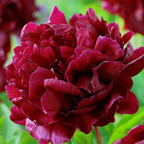 Цветки пиона Армани поражают своим величием. С диаметром до 20 см они являются настоящей находкой для ценителей прекрасного. В начале цветения они поражают рубиново-красным оттенком, который затем трансформируется в бордово-красный. Это цветение характеризуется обилием и продолжительным сроком — с июня по июль, продолжительностью около 4 недель, что дарит саду атмосферу праздника и радости.