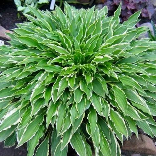 Хоста Стилетто — это невысокий, но пышный и компактный куст, который достигает высоты всего 20-30 см и ширины 60 см. Ее характер роста можно охарактеризовать как низкорослый, с высокой интенсивностью разрастания. Узкие листья длиной до 17 см и шириной 2 см имеют желобчатую текстуру и волнистый край. Декоративность этой хосты подчеркивает темно-зеленая окраска листьев, обрамленная серебристо-белой каймой. Такой уникальный цветовой акцент делает Стилетто идеальным выбором для создания стильных ландшафтных композиций.