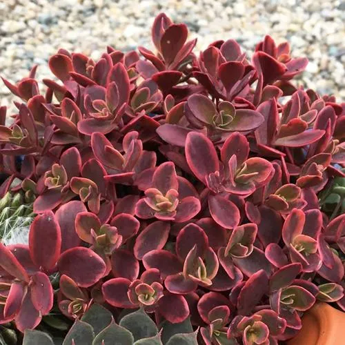 Саженец отличается компактностью, достигая высоты всего 15 см, при этом разрастается в ширину на 40 см. Его стебли имеют прямостоячее направление роста, что способствует образованию плотной зеленой подушки. Листья мелкие, с простой формой и блестящей поверхностью, что создает уникальный визуальный эффект. Базовая окраска листьев розовая, однако вместе с изменением сезонов и температурных условий, их цвет варьируется от богатого бордового и красного до вишнево-красного, а в осенний период становится тыквенно-оранжевым.