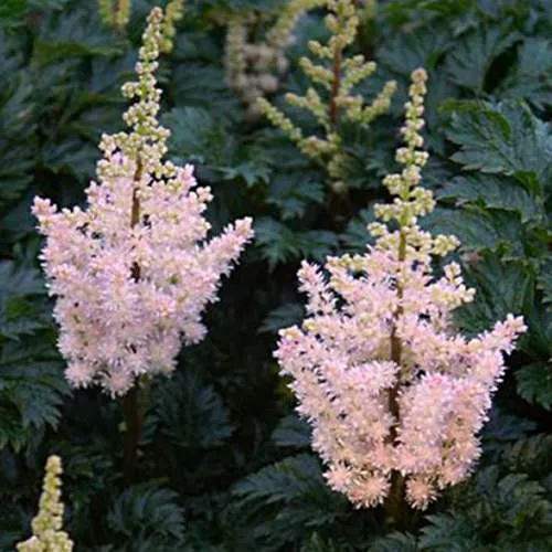С июля по август Астильба радует глаз своими крупными ромбовидными соцветиями, окрашенными в бледно-розовый цвет с лососевым оттенком. Плотные и ажурные, они создадут атмосферу легкости и воздушности в вашем ландшафте.