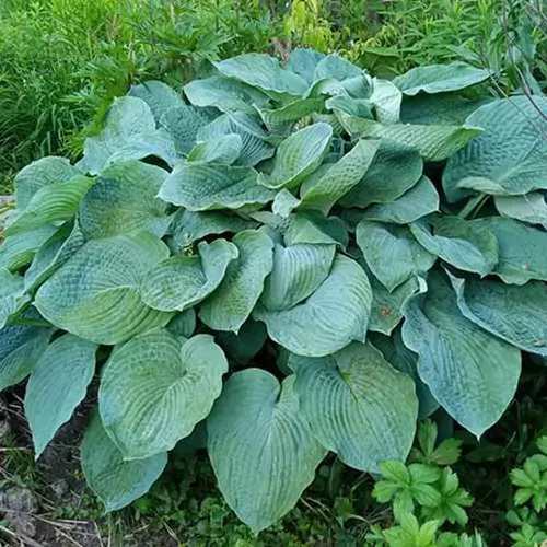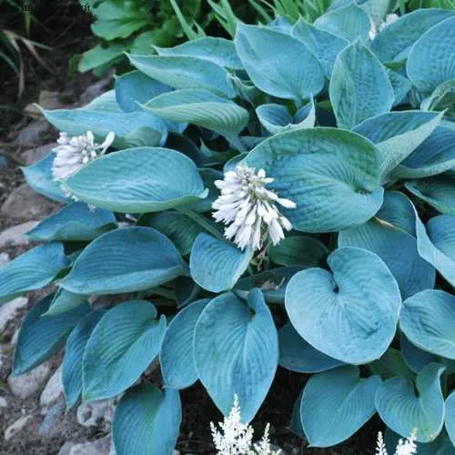 Хоста «Элеганс» заслуженно привлекает внимание своей крупной голубой листвой, которая отличается высокими декоративными качествами. Листья имеют широко сердцевидную форму, длиной до 36 см, а их плотная текстура с морщинистым рельефом и ярко выраженным жилкованием придает растению особый шарм. В начале сезона листья окрашены в насыщенный голубой цвет, который со временем трансформируется в сине-зеленый, создавая эффектный контраст с голубой каймой.