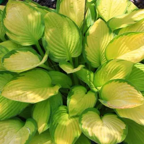 Каждый лист хосты — это произведение искусства! Кожистые, сердцевидные листья длиной до 25 см и шириной 15 см имеют невероятную текстуру: гофрированные, матовые с сизым налетом снизу. Центр листа насыщенно золотисто-желтый, элегантно обрамленный темно-зеленой полоской с плавным переходом к салатовому. Край листа остроконечный – он добавляет дополнительную изюминку в общую композицию.