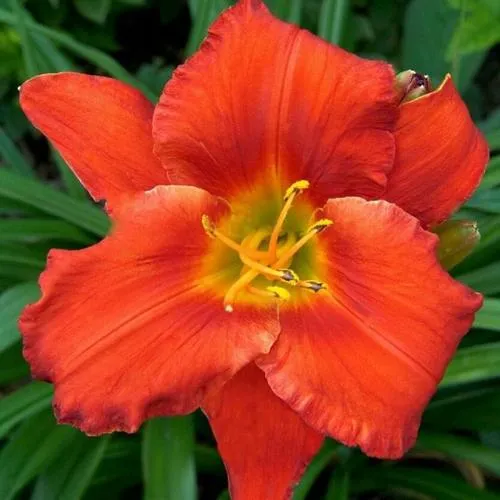 Цветки лилейника Амадеус поражают своей аккуратностью и красотой. Основная окраска цветка — насыщенный алый цвет, что придает ему яркий и запоминающийся вид. Лепестки цветка волнистые. Период цветения начинается в конце июля, возможно и повторное цветение.
