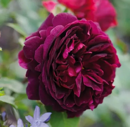 Цветки крупные — до 10 см в диаметре, густомахровые, чашевидные, с классической розеточной формой. Бутоны раскрываются медленно, сохраняя насыщенный винно-пурпурный цвет даже в условиях яркого солнца и повышенной влажности. Бархатистая текстура лепестков добавляет объем и глубину, а насыщенный аромат с фруктовыми нотами черной смородины и малины делает куст настоящим ароматическим центром сада.