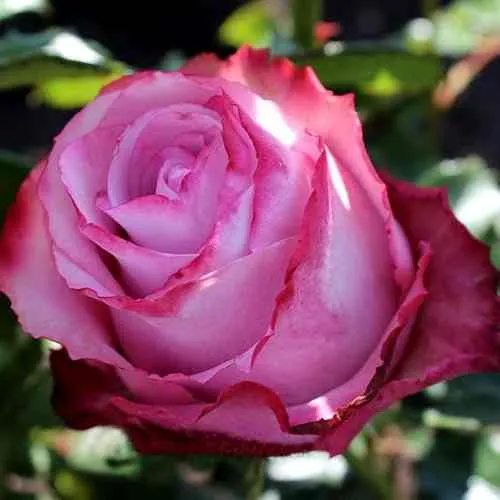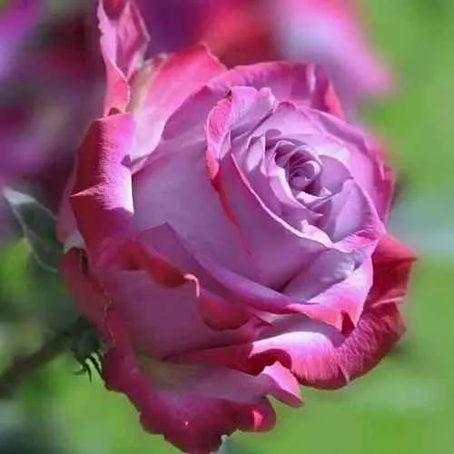 Данный сорт был выведен в Германии. Лепестки цветков окрашены в насыщенный сиренево-розовый оттенок. Необычное сочетание сразу бросается в глаза, привлекая внимание яркостью. Роза двухцветная. Закрытые бутоны имеют форму плотного бокала, а форма раскрывшихся цветков – классическая. Диаметр составляет до 12 сантиметров. Размеры крупные. В одном цветке собрано до 50 лепестков (густомахровые цветки). Расположены они поодиночке на каждом стебле.