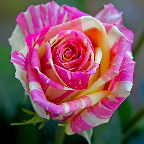 Основную окраску цветка можно охарактеризовать как ярко выраженный желто-розовый градиент. Переход от молочно-желтых к нежно-розовым тонам с лимонными и кремовыми полосками придает цветку необычайную живописность и объем. Пестрые, градиентные лепестки делают "Фиесту" настоящей королевой среди чайно-гибридных роз.