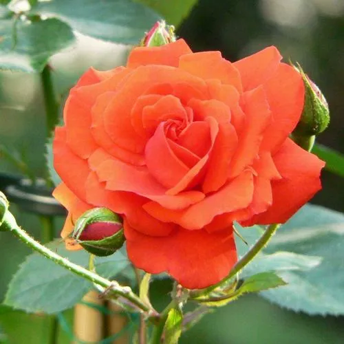 Чайно-гибридная роза 'Мерседес' поражает своей яркой, насыщенной окраской цветов. Основной оттенок цветка оранжево-красный, практически морковный, что делает его особенно привлекательным и неповторимым. Бутон имеет заостренную форму, а распустившийся цветок напоминает идеальный бокал. Размер цветка крупный, диаметр достигает 10-11 см, при этом цветы среднемахровые с количеством лепестков от 35 до 40.