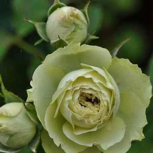 Бутоны овальные, заостренные. Цветки зеленовато-белые, стойкие, чашевидные, мелкие (2—3 см), махровые (30—40 лепестков), без запаха, одиночные и в соцветиях до 8. Листья вытянуто-заостренные, темно-зеленые, кожистые, матовые. Кусты ровные, компактные. Цветение обильное, повторное до морозов.