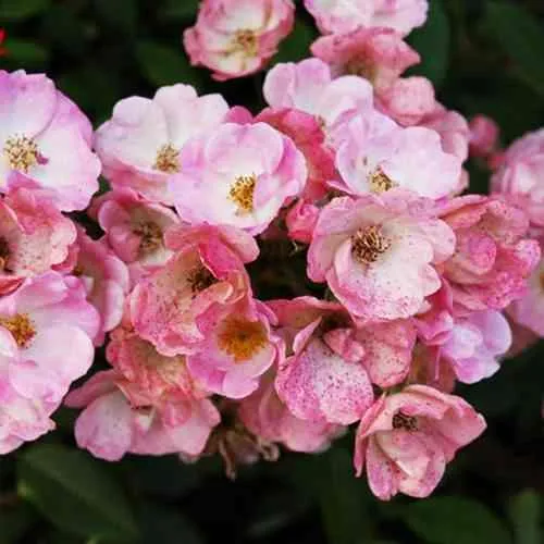 Цветы розы Алден Бизен имеют ярко-розовый оттенок, который плавно переходит в светло-розовый, а их перламутровая обратная сторона лепестков добавляет дополнительного шарма. При этом белый центр с желтыми тычинками создает контраст, который просто завораживает. Цветы чашевидной формы достигают среднего размера — 3-4 см в диаметре, складываясь из 4-11 лепестков. Они располагаются в соцветиях, что придает кустам особую декоративность.