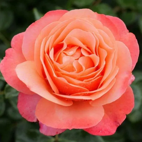 Основной акцент в этом сорте — его цветок. Бутоны округлой формы раскрываются в элегантные чашевидные цветки диаметром 7–8 см. Их окраска уникальна: сочетание абрикосово-лососевых и розовых тонов с лёгкой розовой каймой по краю лепестков создаёт мягкий, но яркий визуальный образ. Цветы умеренно махровые (17–25 лепестков), с пышным, насыщенным центром и изящной формой, которая долго сохраняется в жару и после дождя. Аромат — нежный, с выраженными фруктовыми нотами. Он достаточно сильный, чтобы быть заметным, но не резкий, благодаря чему сорт идеально подходит для посадки вблизи зон отдыха.