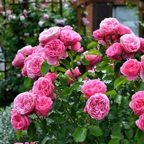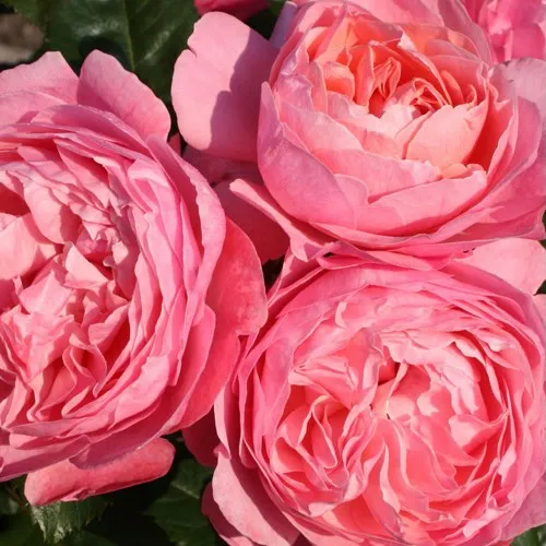 Цветки крупные, диаметром 8–10 см, густомахровые — до 60 лепестков. Каждый бутон имеет выразительную шаровидную форму, постепенно раскрываясь в плотно набитую розетку. Основной цвет — насыщенно-розовый, местами с мягкими персиковыми переливами, не выгорает на солнце и сохраняет яркость в любую погоду. Цветение — повторное, волнообразное: с июня до октября. В каждом соцветии — 3–5 цветков, цветение обильное, практически непрерывное.