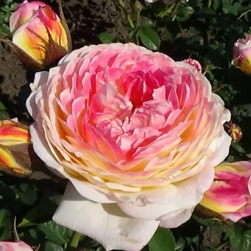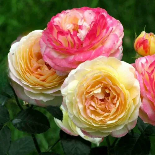 Цветы Розомана Жанон поражают своей красочной палитрой. Бутоны имеют оранжево-красный оттенок, который плавно переходит в удивительно нежные цветы с основным желтым окрасом и розовыми тонами. Распустившиеся цветы достигают впечатляющего размера до 11-12 см в диаметре и обладают густомахровой структурой, содержащей 50-60 лепестков. Интенсивная насыщенность цвета и оригинальная форма цветка в виде шара делают растения особенно привлекательными. Аромат розы фруктовый с замечательными нотами мандарина и ванили, а его средняя интенсивность добавляет приятный акцент к комплексу ощущения от цветения.