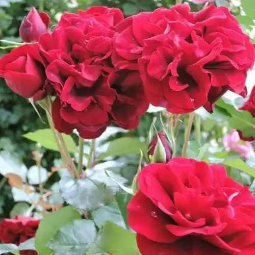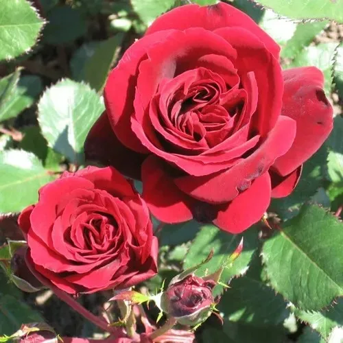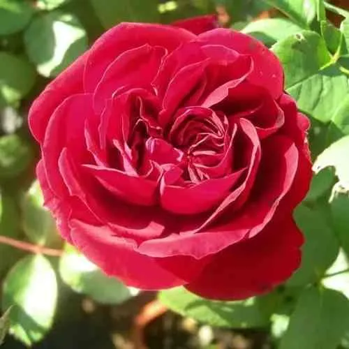 Прямостоячий куст с темно-красными цветками старинной формы. Молодая листва бронзово-красная, позднее темно-зеленая, блестящая. Высота 120-150 см