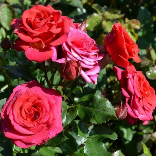 Розы спрей Мирабель впечатляют своей ярко-красной окраской, которая не просто красная, а насыщенно и ярко-красная. Цветок имеет классическую бокаловидную форму и не отличается большим размером — диаметр цветка составляет до 4-5 см. Эти цветы густомахровые, что делает их особенно привлекательными — на одном стебле можно увидеть до 3-5 цветов, собранных в изящные соцветия. Аромат у розы приятный, с нежными фруктовыми нотками, хотя и слабой интенсивности, что добавляет общей утончённости.