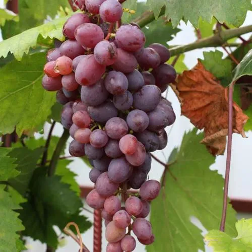 Крупные грозди сорта Кишмиш Запорожский достигают 600-900 граммов и обладают конической формой, иногда с заметными "крыльями". Они характеризуются средней плотностью, хотя иногда могут быть и несколько рыхлыми. Ягоды крупные, 16-19 х 15-17 мм, массой около 2-2,5 г, овальной формы, окрашены в глубокий темно-красный или темно-фиолетовый цвет. Их гармоничный, мясисто-сочный вкус станет отличным дополнением к любому столу или основой для изысканных десертов.