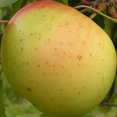 - Плоскоокруглой, немного уплощённой формы, желтовато-зелёного, с размытым розовым покровом, цвета. Кожица ровная и прочная, покрыта малым количеством светлых подкожных точек. Мякоть плотная и сочная, по структуре - хрустящая, жёлто-белого цвета;