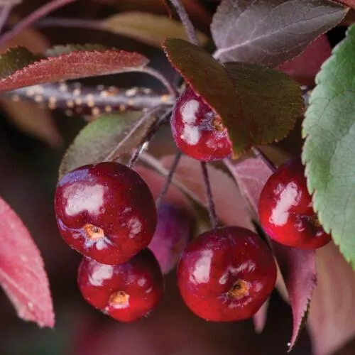 - Приплюснуто-округлой формы, тёмно-красного цвета, эффектно украшают яблоню;