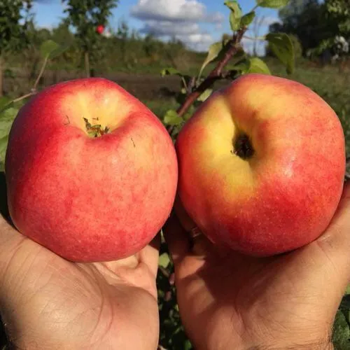 - Плоско-округлой формы, желтовато-зелёного, с выделяющимся тёмно-красным покровом, цвета. Кожица кажется гладкой, немного маслянистой. Мякоть кремового цвета;