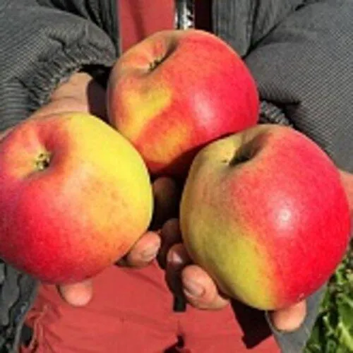 - Плоско-округлой формы, зеленовато-жёлтого, с выделяющимся тёмно-красным покровом и блеском, цвета. Мякоть плотная и сочная, кремового цвета;